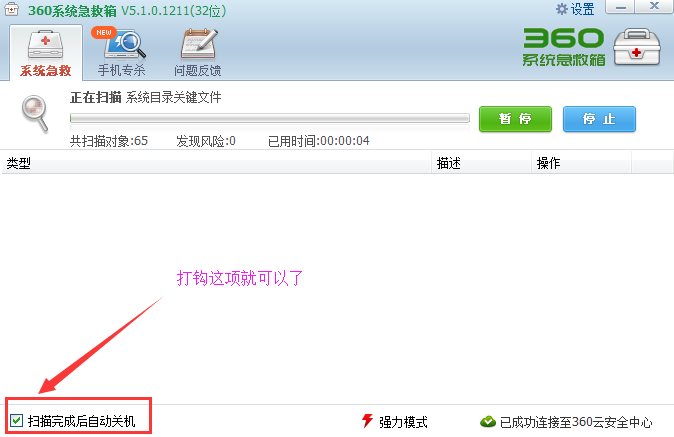 ⒏.360系统急救箱正在查杀流氓病毒中。。。 (^-^)【提示:为保险起见,第一次杀完关机重启电脑后,再使用360系统急救箱重新杀一次。】 | |